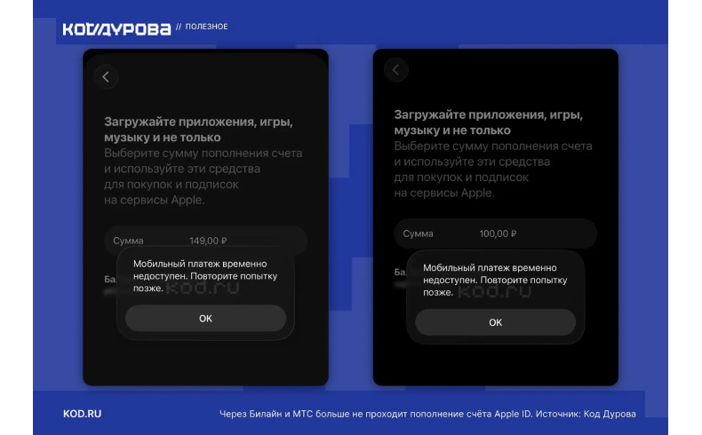 С 1 апреля 2023 года пользователи из России столкнулись с дополнительными ограничениями. Теперь они не могут пополнять баланс Apple ID с помощью средств, находящихся на счетах мобильных телефонов. Это решение было принято по указанию главы Минцифры и направлено на предотвращение оплаты VPN-сервисов.