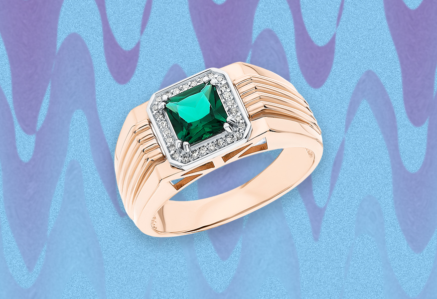 Уникальное кольцо с изумрудом и бриллиантами из розового и белого золота 585 пробы точно привлечёт внимание к его хозяину. Кольцо украшено гидротермальным изумрудом 0.87 карат и 28 бриллиантами 0.07 карат. По бокам кольца печатка дополнена вставками, которые делают украшение более мужественным.