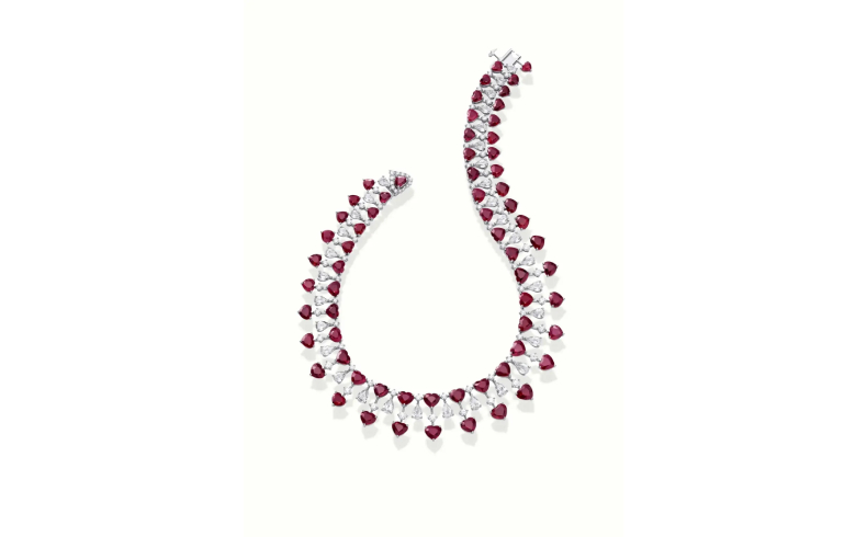 За привлекательностью комплекта скрывается виртуозная работа с цветом, светом и эмоцией. Колье, выполненное из этичного белого золота, представляет собой пульсирующую линию алых сердец. Шестьдесят четыре рубина, ограненные в форме сердца, складываются в непрерывную ленту, которая, словно живое существо, вспыхивает на коже. Каждый рубин, с его глубоким красным цветом, символизирует страсть и любовь, а бриллианты, играющие роль архитектурных элементов, придают композиции четкость и холодное сияние.