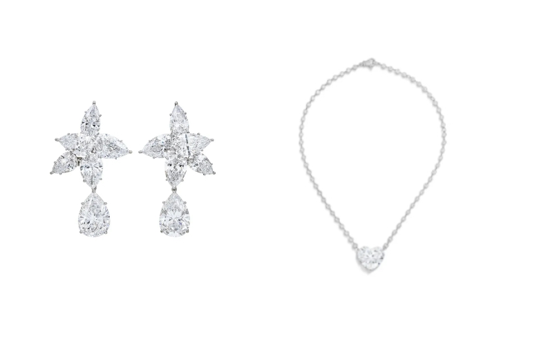 Пара сережек от Fred с бриллиантами грушевидной огранки весом 10,69 и 10,23 карата, дополненных бриллиантами весом от 2,39 до 5,05 карата, будет выставлена на продажу за 2,4 миллиона швейцарских франков (3 миллиона долларов). Не менее впечатляющим станет колье от Ronald Abram, в котором установлен бриллиант в форме сердца весом 36,20 карата. С максимальной оценкой в 2 миллиона швейцарских франков (2,5 миллиона долларов).