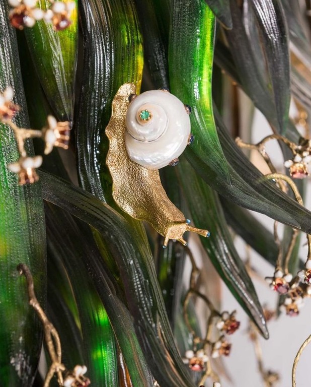 Колумбийский дизайнер по имени Себастьян Харамильо представил миру ювелирное творение в виде люстры. Мастер трудился над осветительным прибором 6 лет, создавая из золота и драгоценных камней искусные фигурки птиц, листьев, улиток, лягушек и насекомых. Необычная люстра получила название Alhaja, что в переводе с испанского означает «драгоценность».