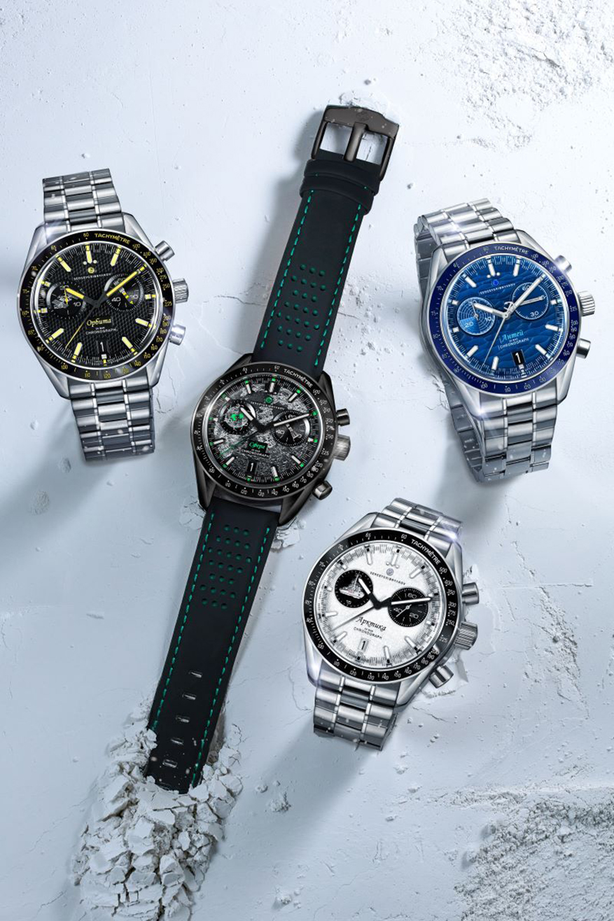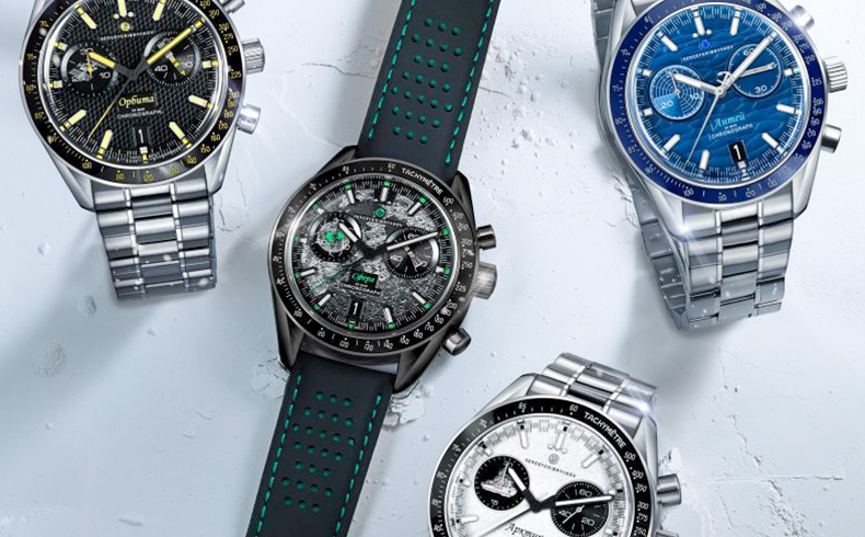«Арктика» посвящена отважным покорителям Севера, тем, кто не побоялся бросить вызов суровым условиям и открыть новые горизонты. «Сфера» – отражение прорывов российской космической индустрии, развития спутниковых систем и технологий дистанционного зондирования Земли. «Атом» – символ научной мысли, хранитель тайн ядерной физики, молчаливый свидетель открытий, меняющих наш мир. «Посейдон» – посвящена профессионалам российского флота, верным своим традициям и выбранному курсу. «Орбита» – воплощение стремления к открытиям и выходу за границы привычного. Каждая модель часов имеет свой уникальный дизайн и украшена выращенными драгоценными камнями, что делает их по-настоящему изысканными.