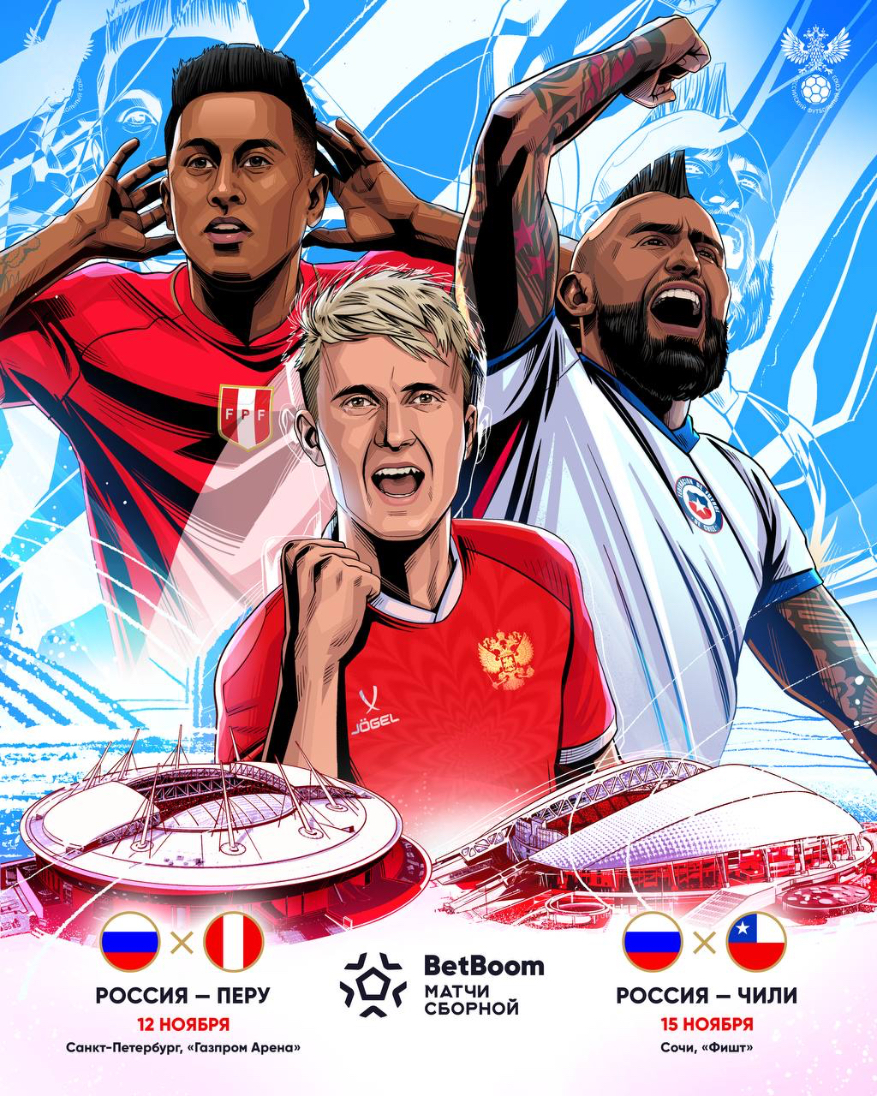 На этой неделе в футболе – перерывы на матчи сборных! Сборная Россия на этой неделе проведет два товарищеских матча. 12 ноября сборная России сыграет со сборной Перу. Матч состоится в Санкт-Петербурге на стадионе «Газпром Арена», начало встречи – в 20:00 (мск). 15 ноября сборная России сыграет со сборной Чили. Матч пройдет в Сочи на стадионе «Фишт», начало игры – в 18:00 (мск).