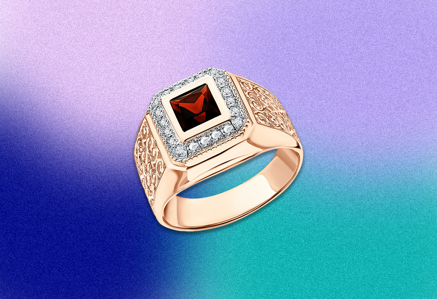 Это кольцо сочетает в себе выразительность и сдержанную мужскую эстетику. Тёплый оттенок золота подчёркивает статус и уверенность, а гранаты добавляют украшению глубину и энергию, ассоциирующуюся с силой и внутренним огнём. Фианиты аккуратно расставляют световые акценты, не перегружая дизайн и сохраняя баланс между классикой и современностью. Кольцо выглядит эффектно, но не вычурно благодаря чётким линиям и продуманной композиции камней.