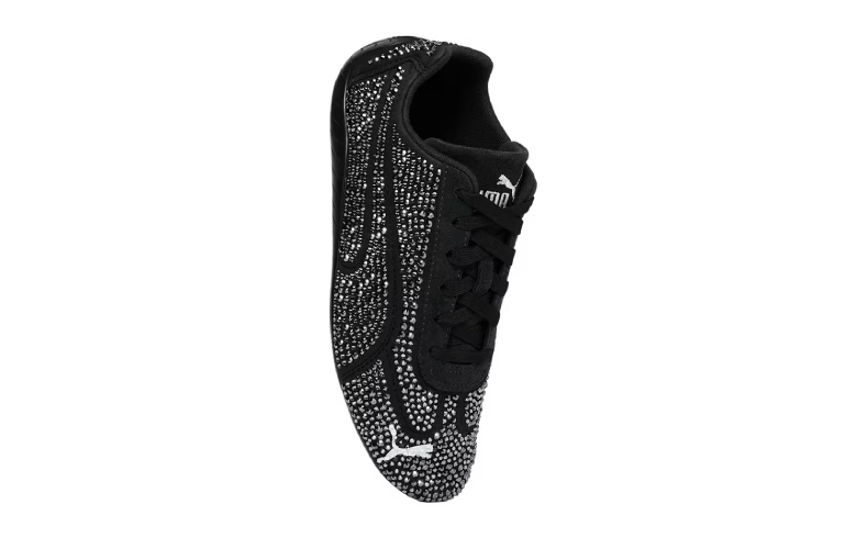 Каждая пара этой ограниченной серии украшена 5316 черными кристаллами, нанесёнными вручную, что делает каждую пару поистине уникальной. Эти кристаллы, как огранённые драгоценности, подчеркивают линии оригинального дизайна, создавая эффект, будто обувь сама по себе является произведением искусства. Под переливающейся поверхностью кристаллов угадывается знакомая архитектура Speedcat — плавные изгибы, аккуратный силуэт и низкий профиль, напоминающий кабину гоночного болида. Контраст между спортивным характером модели и утончённым сиянием кристаллов создает особую энергию — будто ювелирная мастерская встретилась с гоночной трассой.