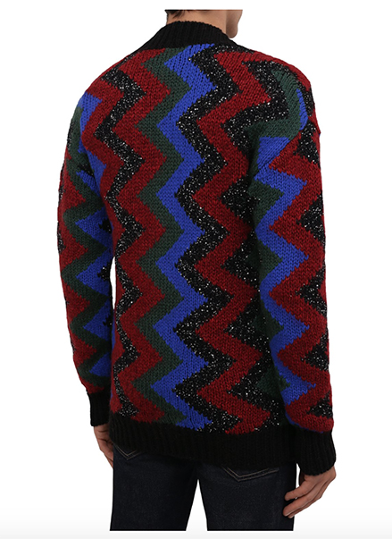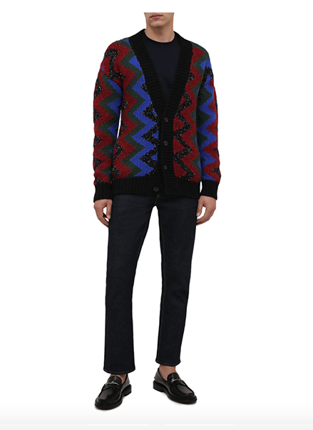 Высокая мода – это всегда про риск. В этом кардигане вы точно не останетесь незамеченными. Зигзагообразный разноцветный узор, мерцающий люрекс и пайетки – просто нереальное сочетание. С таким кардиганом можно носить яркие футболки или кроссовки.