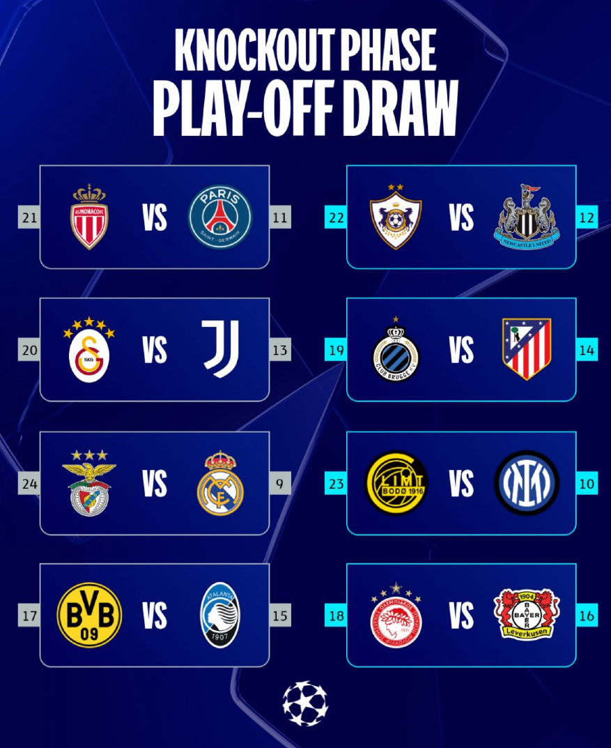 30 января состоялась жеребьевка стыковых матчей Лиги чемпионов. В жеребьевке участвовали команды, занявшие с 9 по 24 места после общего этапа ЛЧ. Первые стыковые матчи пройдут 17 и 18 февраля, ответные матчи – 24 и 25 февраля. Победители стыковых матчей выйдут в 1/8 финала плей-офф, где сыграют с командами, которые вышли в 1/8 плей-офф напрямую.