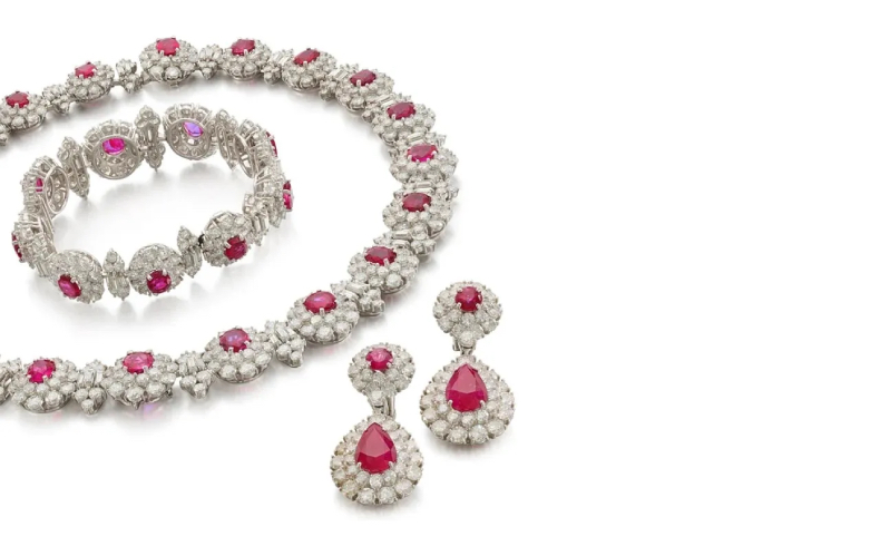 Сет из трех изделий с рубинами и бриллиантами стал настоящей находкой для коллекционеров: он более чем удвоил свою максимальную оценку и достиг 114,3 тысяч фунтов стерлингов. В этот набор входило колье с бирманскими рубинами в форме кушон, обрамленное бриллиантами, а также браслет и клипсы с афганскими или вьетнамскими рубинами.