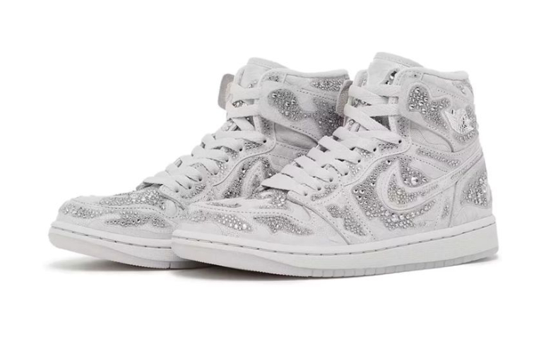 Эта версия Air Jordan 1 High OG отходит от традиционных спортивных атрибутов, предлагая вместо этого изысканный и роскошный дизайн. Светло-серый верх кроссовок служит идеальным фоном для россыпи кристаллов Swarovski, которые мастерски выложены в вихревые линии. Эти линии не только подчеркивают силуэт обуви, но и создают эффект движения, словно кроссовки сами играют с светом.