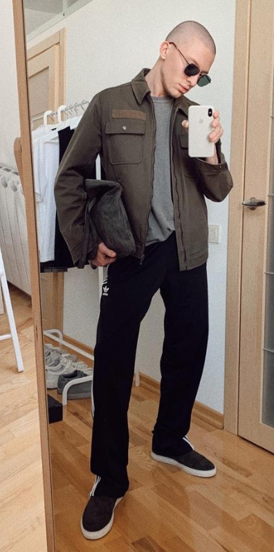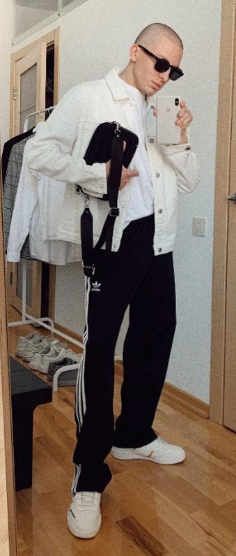 То же самое. Вместо пиджака – структурированная куртка-рубашка. Визуально силуэт кажется вытянутее: кеды сливаются с трениками. Меняем цвета и становится ещё свежее. Советуем использовать аксессуары: можно дополнить образ кепкой или панамой.