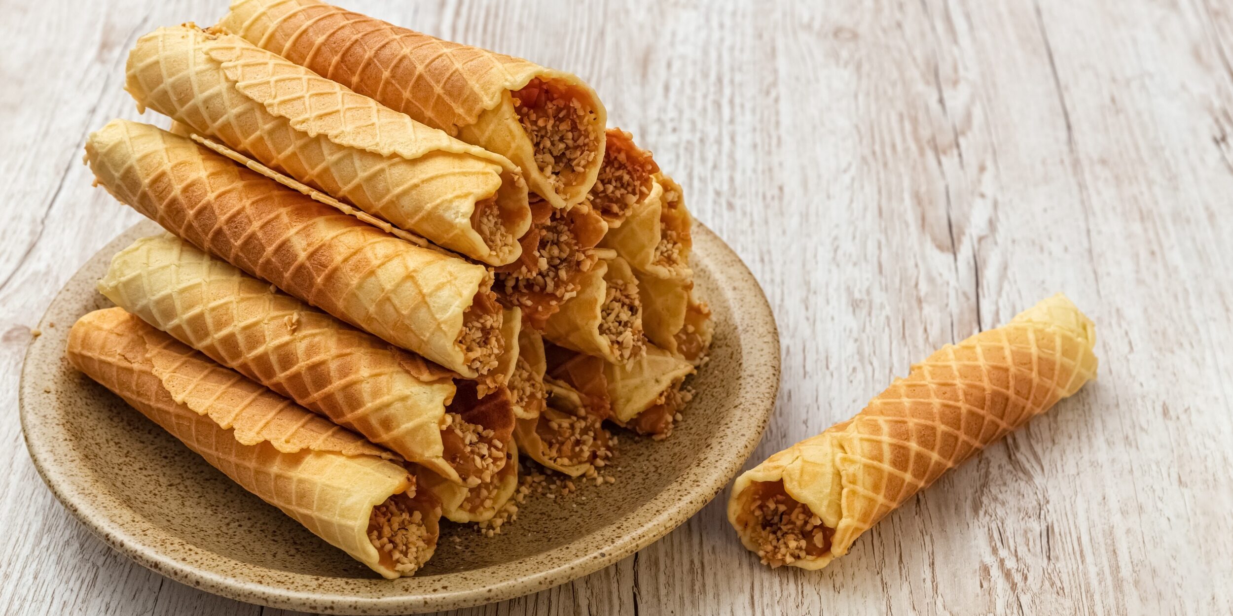Трубочки и орешки, начинённые варёной сгущёнкой – главное лакомство советских детей. Раньше для приготовления этого лакомства использовались специальные формы для орешков, сегодня с этим прекрасно справляются вафельницы. Нужно взбить яйца, добавить растопленное масло, муку и сахар. Жидкое тесто залить в разогретую вафельницу, затем свернуть вафлю в трубочку. С помощью кондитерского пакета начините трубочки сгущёнкой. Для получения особо изысканного крема взбейте сгущёнку со сливочным маслом. Дети будут в восторге.