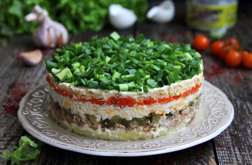 Знаменитый ресторанный салат, который многие домохозяйки пытались скопировать на кухне. Рецепт его удивительно прост и состоит из доступных ингредиентов: картофеля, моркови, огурца, печени минтая, яйца, майонеза, горошка. Быстрое и вкусное угощение отлично дополняло стол в советское время и эффектно смотрелось благодаря разноцветным слоям.