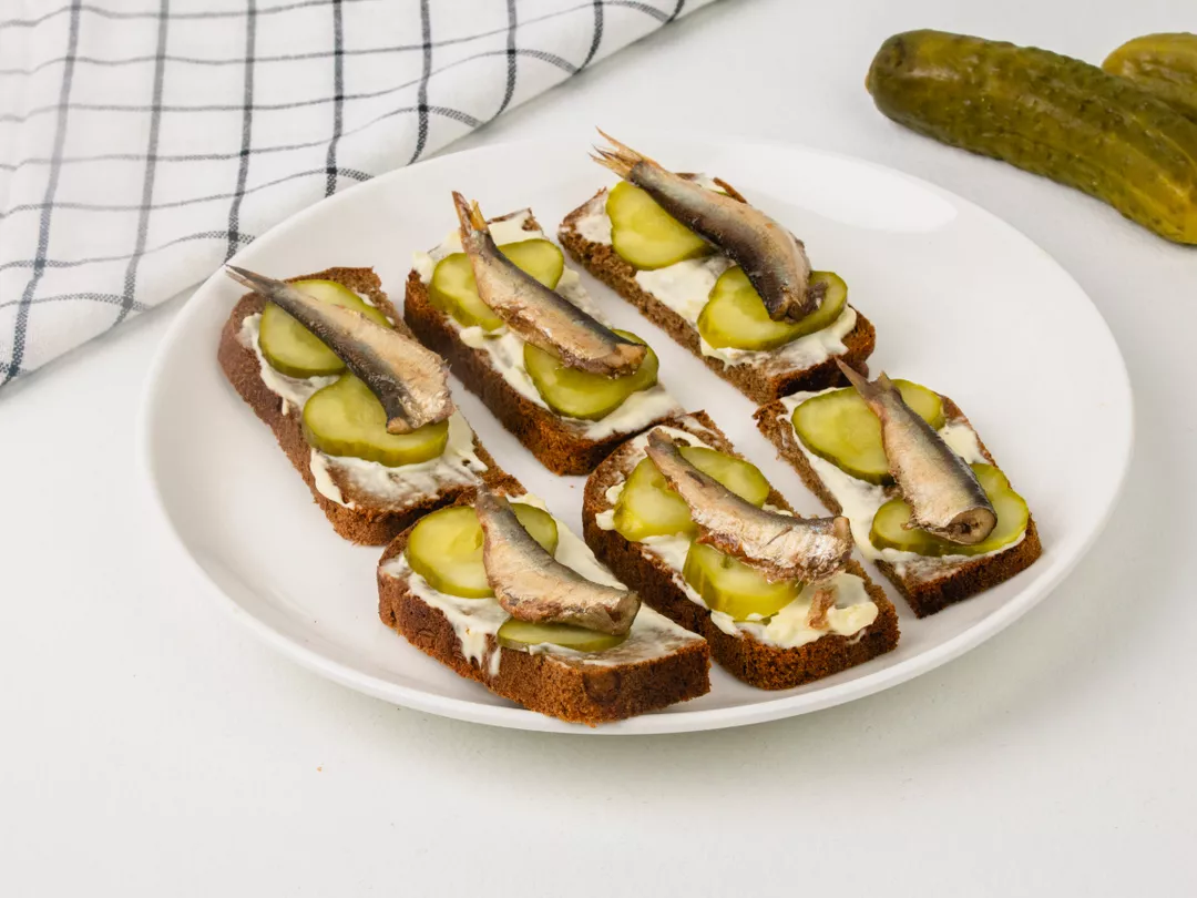 Сейчас шпротами на столе никого не удивишь, а раньше шпроты были дефицитным деликатесом, поэтому их подавали только по праздникам и далеко не в каждой семье. Шпроты либо просто выкладывали на тарелку, либо делали из них бутерброды. На бородинский хлеб выкладывали колечки лука, маринованные огурчики, а поверх всего – пару рыбок.